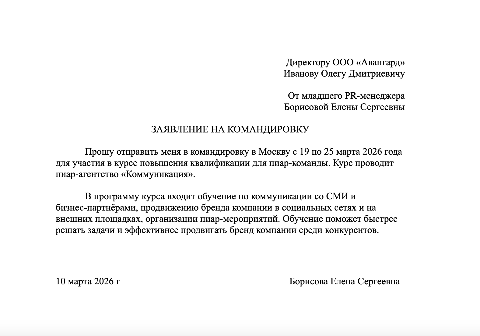 Обычно командировку для сотрудника оформляет работодатель. При этом сотрудник может сам попросить работодателя отправить его в рабочую поездку. В этом случае сотрудник должен составить заявление на командировку. Рассказываем, как составить документ, и делимся шаблоном заявления.