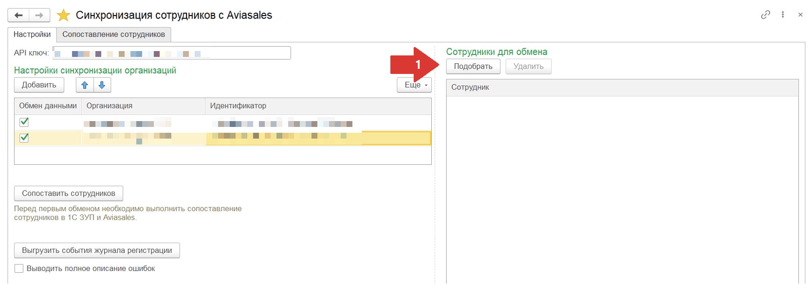 В правой части формы обработки находится список сотрудников для обмена. Синхронизация будет производиться только по сотрудникам из этого списка. Чтобы добавить сотрудников этот список, нажмите на кнопку «Подобрать» (см. стрелочку 1 на скриншоте ниже).