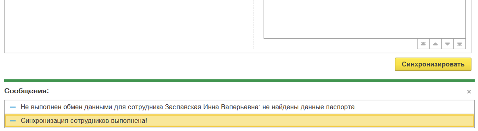 После завершения синхронизации будет выведено сообщение «Синхронизация сотрудников завершена!». Перед сообщение о успешном выполнении синхронизации, выводятся сообщения с ошибками.