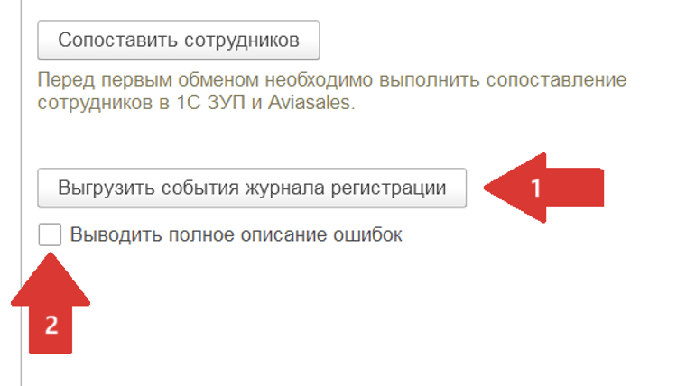 Для выгрузки логов с ошибками нажмите кнопку «Выгрузить события журнала регистрации» (см. стрелочку 1 на скриншоте ниже). Если у вас отключен журнал регистрации, установите галочку «Выводить полное описание ошибок» (см. стрелочку 2 на скриншоте ниже). В сообщениях с ошибками начнут выводиться технические подробности.