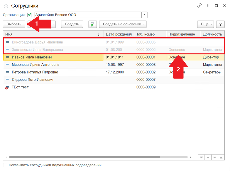 - Эта строка выделена красным фоном – именно в ней нужно выбрать сотрудника в «Сотрудник в 1С ЗУП».