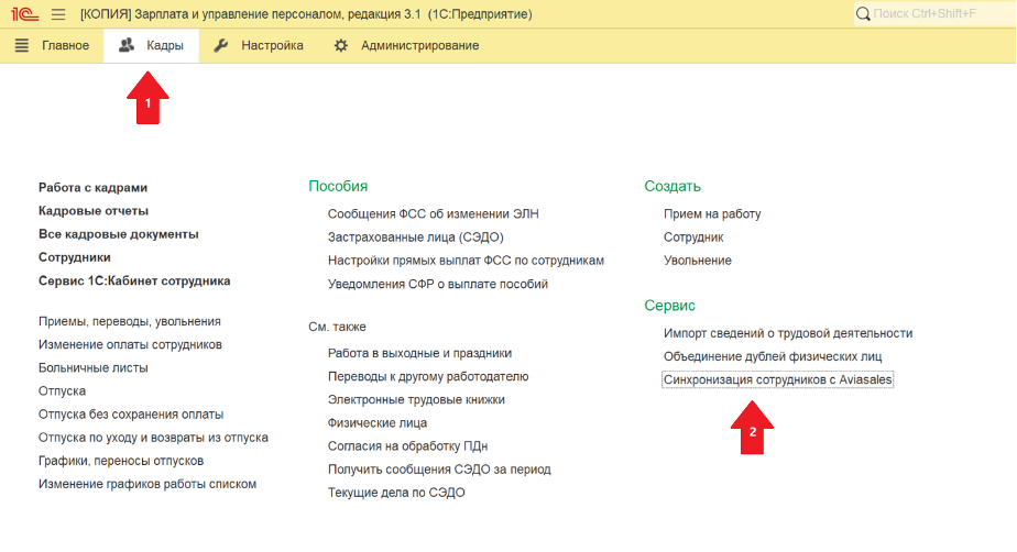 После установки расширения запустите 1С ЗУП и перейдите в раздел Кадры (см. пункт 1 на скриншоте ниже) и открыть обработку «Синхронизация сотрудников с Aviasales» (см. пункт 2 на скриншоте ниже) в подменю Сервис.
