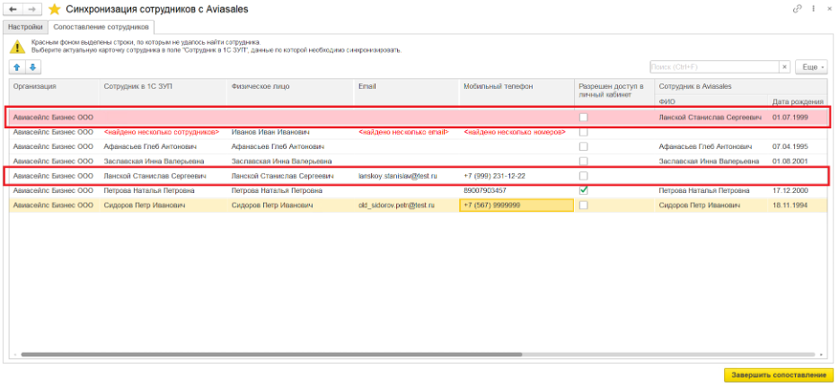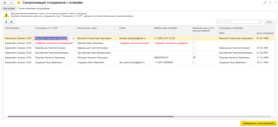 Во вкладке «Сопоставление сотрудников» выводятся все сотрудники из ЛК «Авиасейлс для бизнеса», по выбранным организациям в настройках.