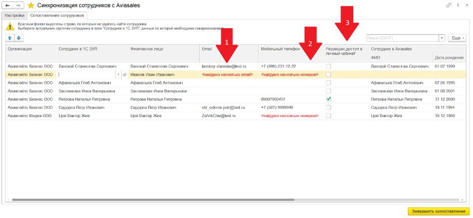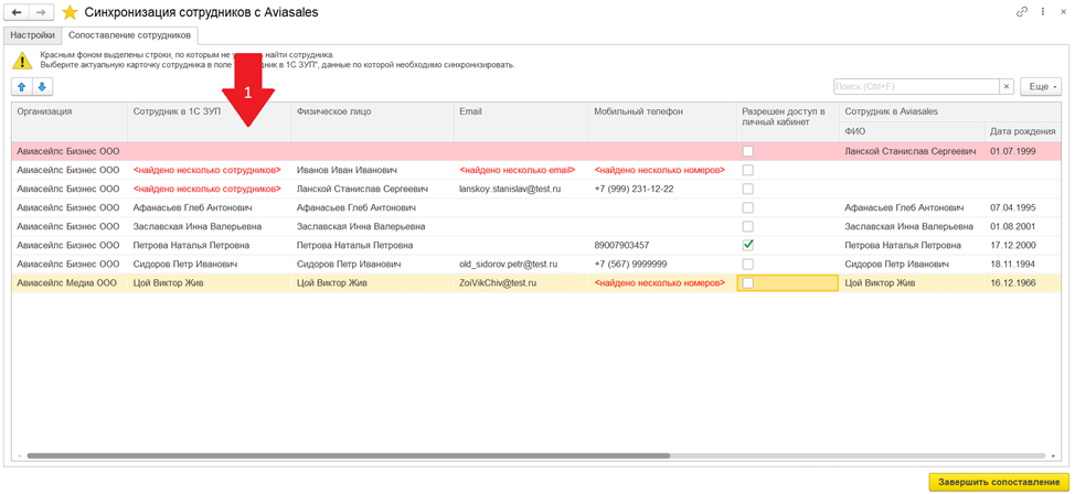 После нажатия на кнопку «Сопоставить сотрудников» откроется вкладка с сопоставленными сотрудниками. В таблице заполнены сотрудники из ЛК «Авиасейлс для бизнеса» в колонке «Сотрудник в Aviasales». В колонке «Сотрудник в 1С ЗУП» заполнены элементы справочника «Сотрудники», которые совпали с сотрудниками из ЛК «Авиасейлс для бизнеса» по ФИО и дате рождения. Заполните пустые ячейки сотрудников в колонке «Сотрудник в 1С ЗУП» (см. пункт 1 на скриншоте ниже).