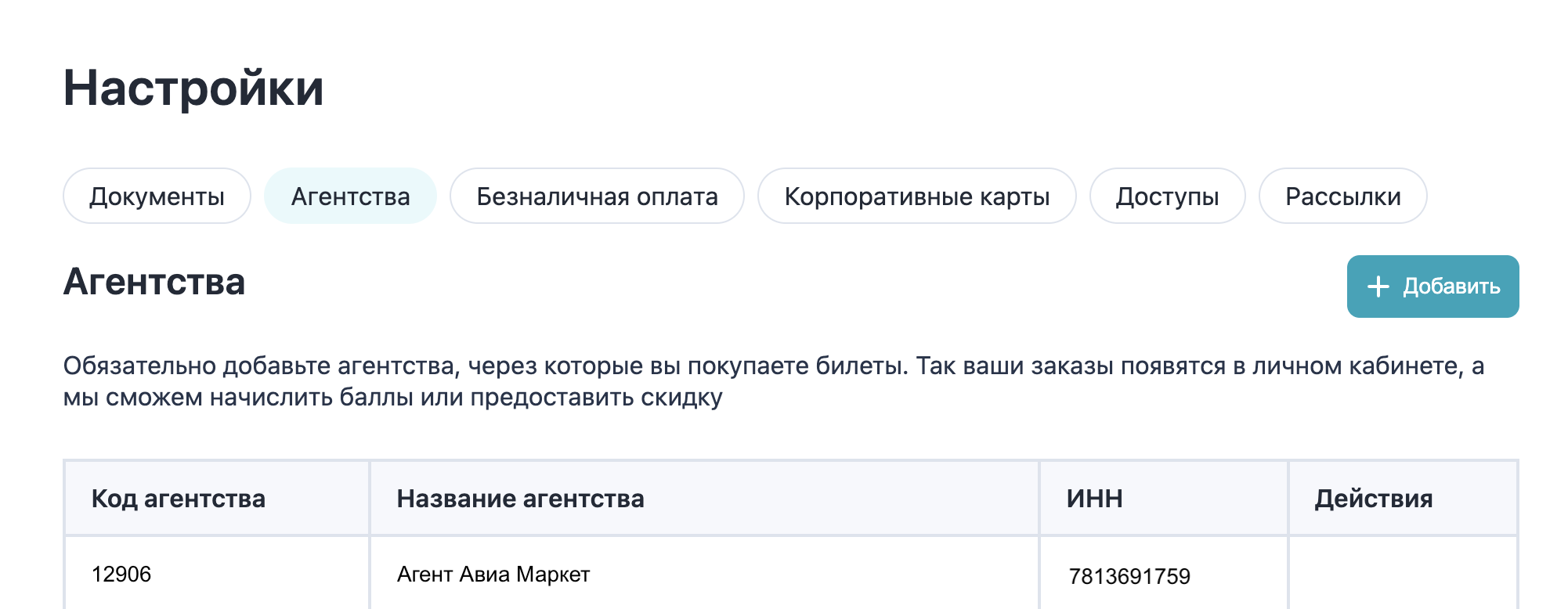 3. Перейдите в личный кабинет S7 Corp и откройте раздел Агенты. Добавьте агента Агент Авиа Маркет (ИНН 7813691759).