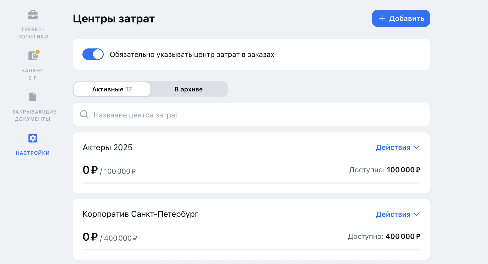 Центры затрат находятся в разделе «Настройки» личного кабинета. Здесь можно создать новый, отредактировать существующий, а также посмотреть список активных и архивных центров затрат.