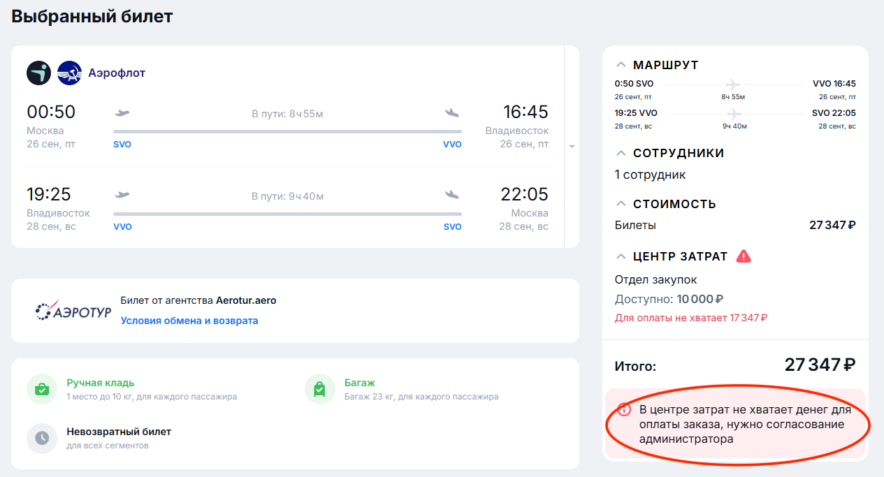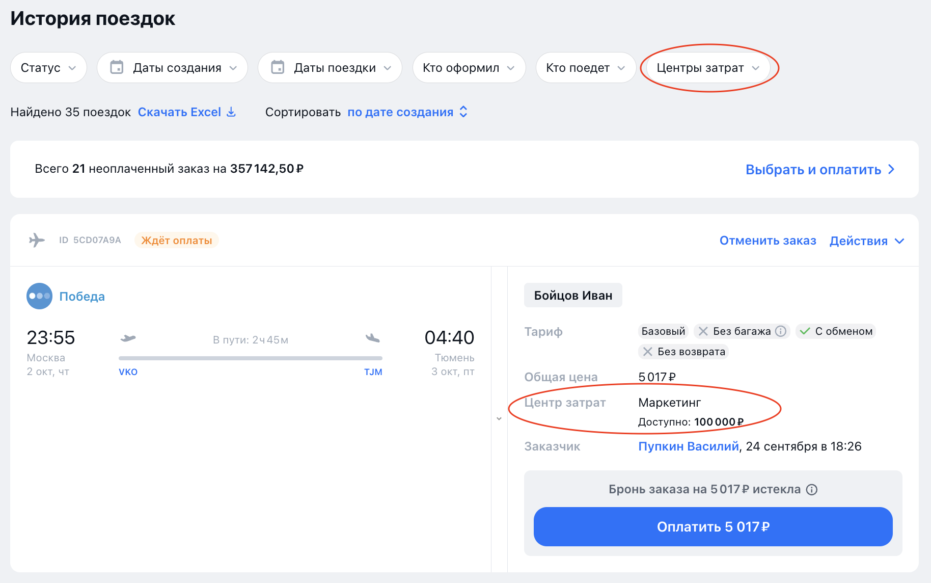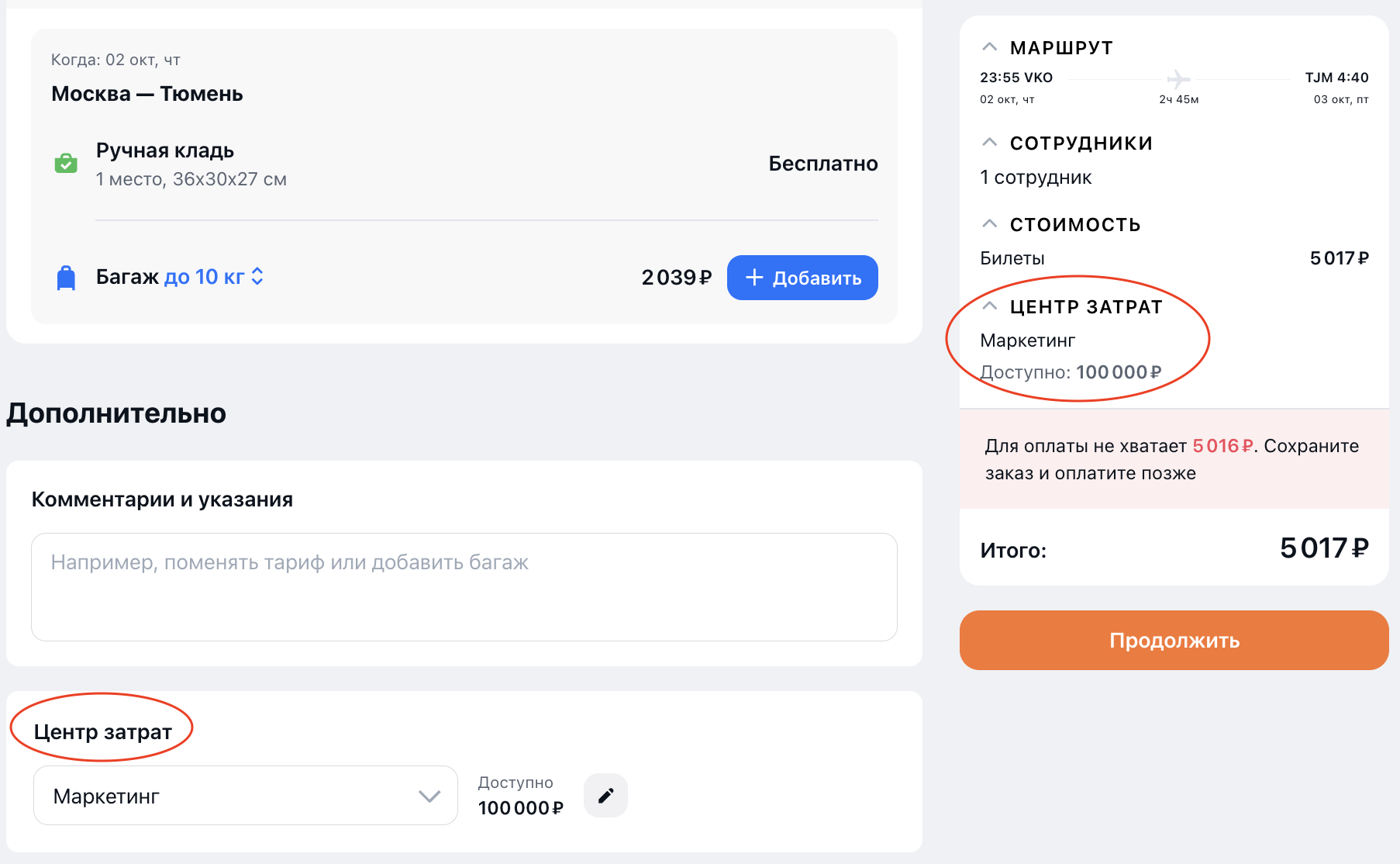 При покупке билета выбор центра затрат находится внизу страницы, в блоке «Дополнительно».