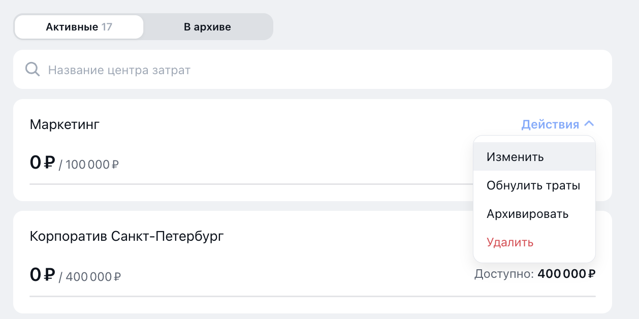 Центры затрат находятся в разделе «Настройки» личного кабинета. Здесь можно создать новый, отредактировать существующий, а также посмотреть список активных и архивных центров затрат.