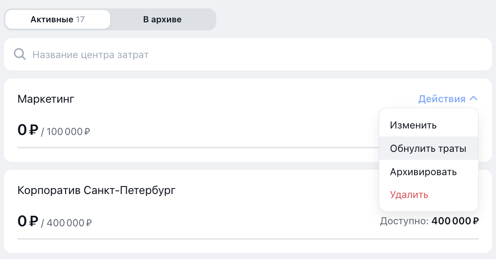 В любой момент траты можно обнулить, чтобы начать отсчёт заново. Чаще всего это делают раз в месяц, если у компании месячные бюджеты.